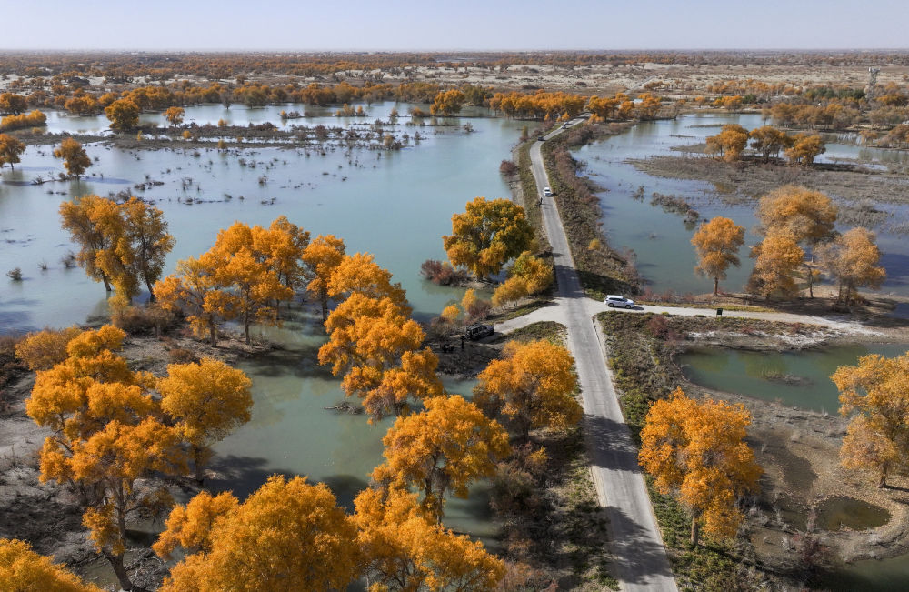 2023年11月4日拍攝的新疆尉犁縣羅布淖爾國家濕地公園(無人機(jī)照片)。新疆沿塔里木河流域分布著約1500萬畝胡楊林,是世界面積最大的胡楊林區(qū)。
