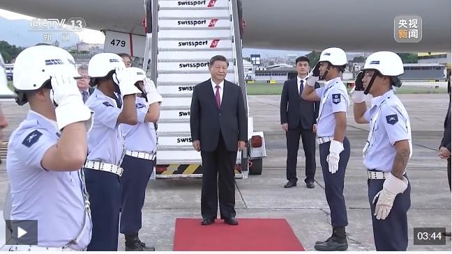 當(dāng)?shù)貢r(shí)間11月17日下午,習(xí)主席乘專機(jī)抵達(dá)里約熱內(nèi)盧加里昂空軍基地。巴西政府高級官員熱情迎接。巴西空軍號手吹號致敬,禮兵分列紅毯兩側(cè)。