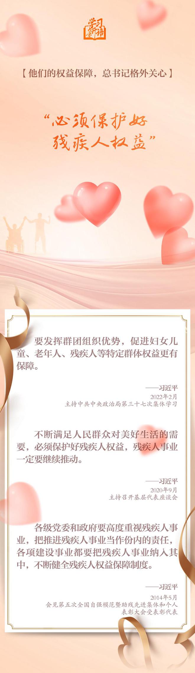 我國(guó)有8500萬(wàn)殘疾人。在習(xí)近平總書(shū)記心中,殘疾人是一個(gè)特殊困難的群體,需要格外關(guān)心、格外關(guān)注。總書(shū)記的一句句溫暖話語(yǔ)、一次次深情囑托,讓廣大殘疾人心田滋潤(rùn)、滿懷希望。