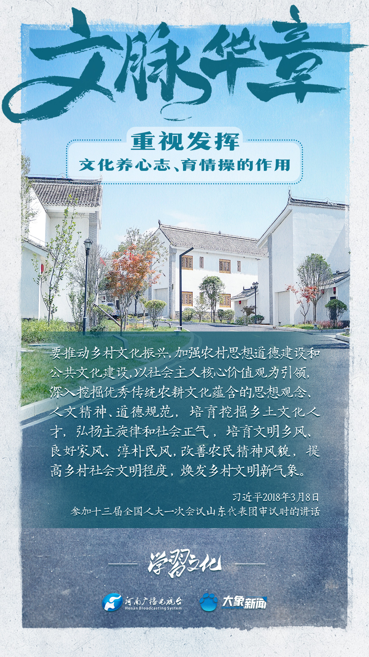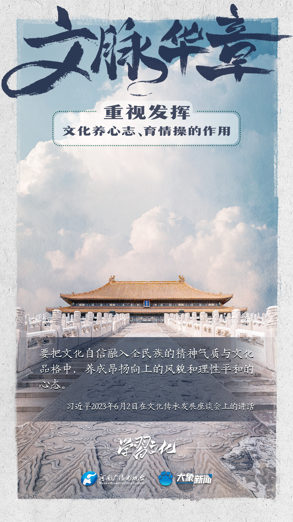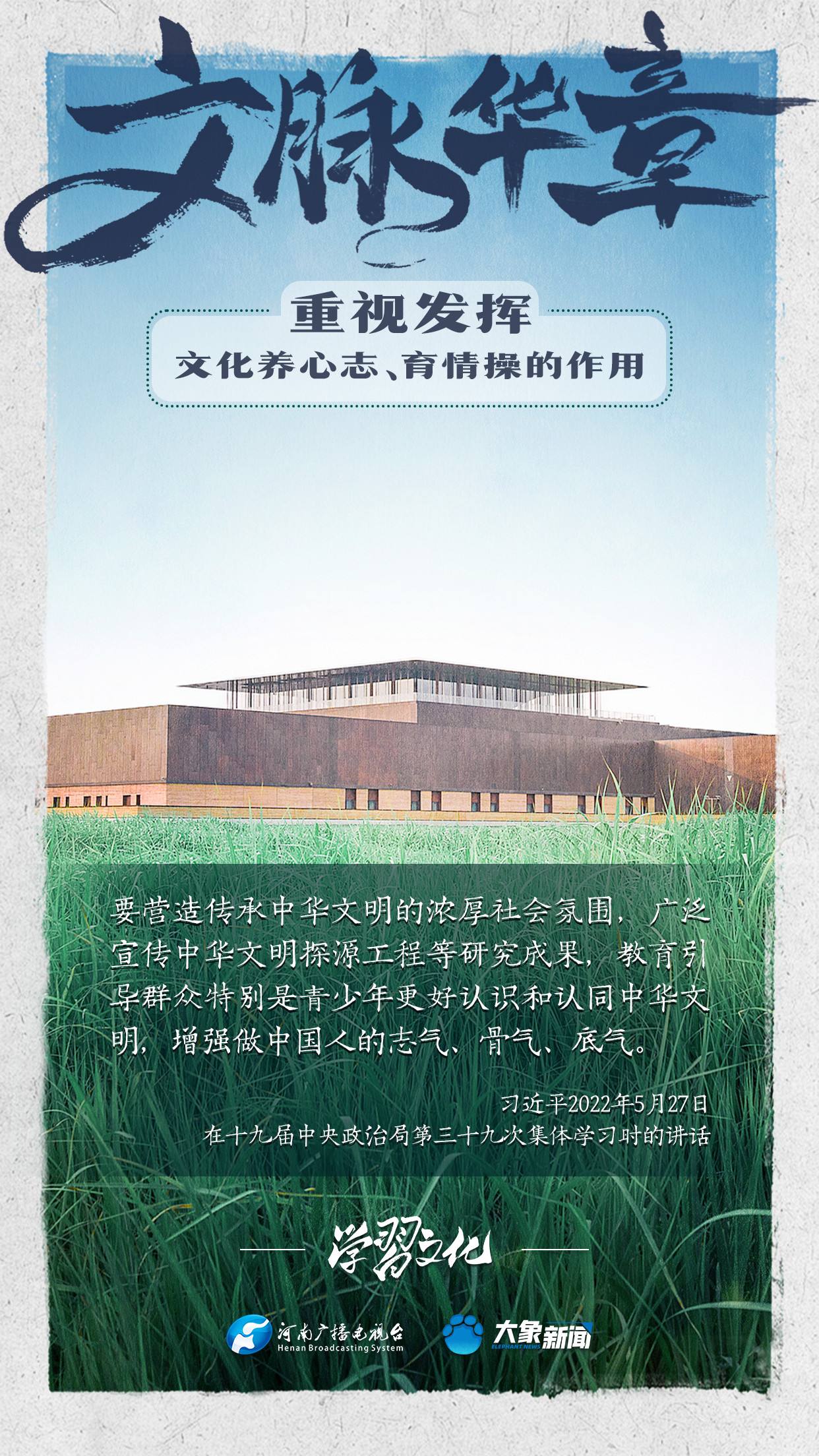 習(xí)近平總書記在主持中共中央政治局第十七次集體學(xué)習(xí)時強調(diào),重視發(fā)揮文化養(yǎng)心志、育情操的作用,涵養(yǎng)全民族昂揚奮發(fā)的精神氣質(zhì)??倳浉叨戎匾曃幕淖饔?,發(fā)表了一系列重要講話,倡導(dǎo)以文載道、以文傳聲、以文化人。我們一起學(xué)習(xí)。