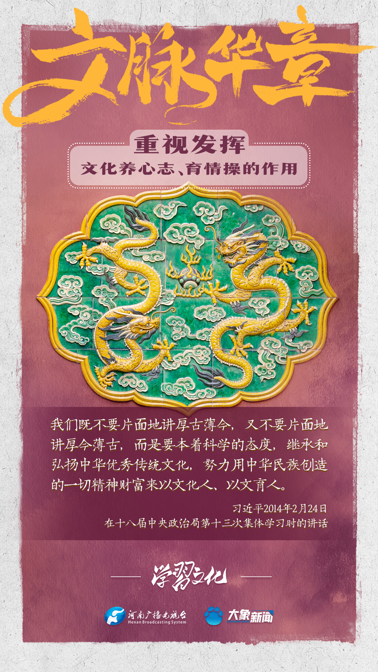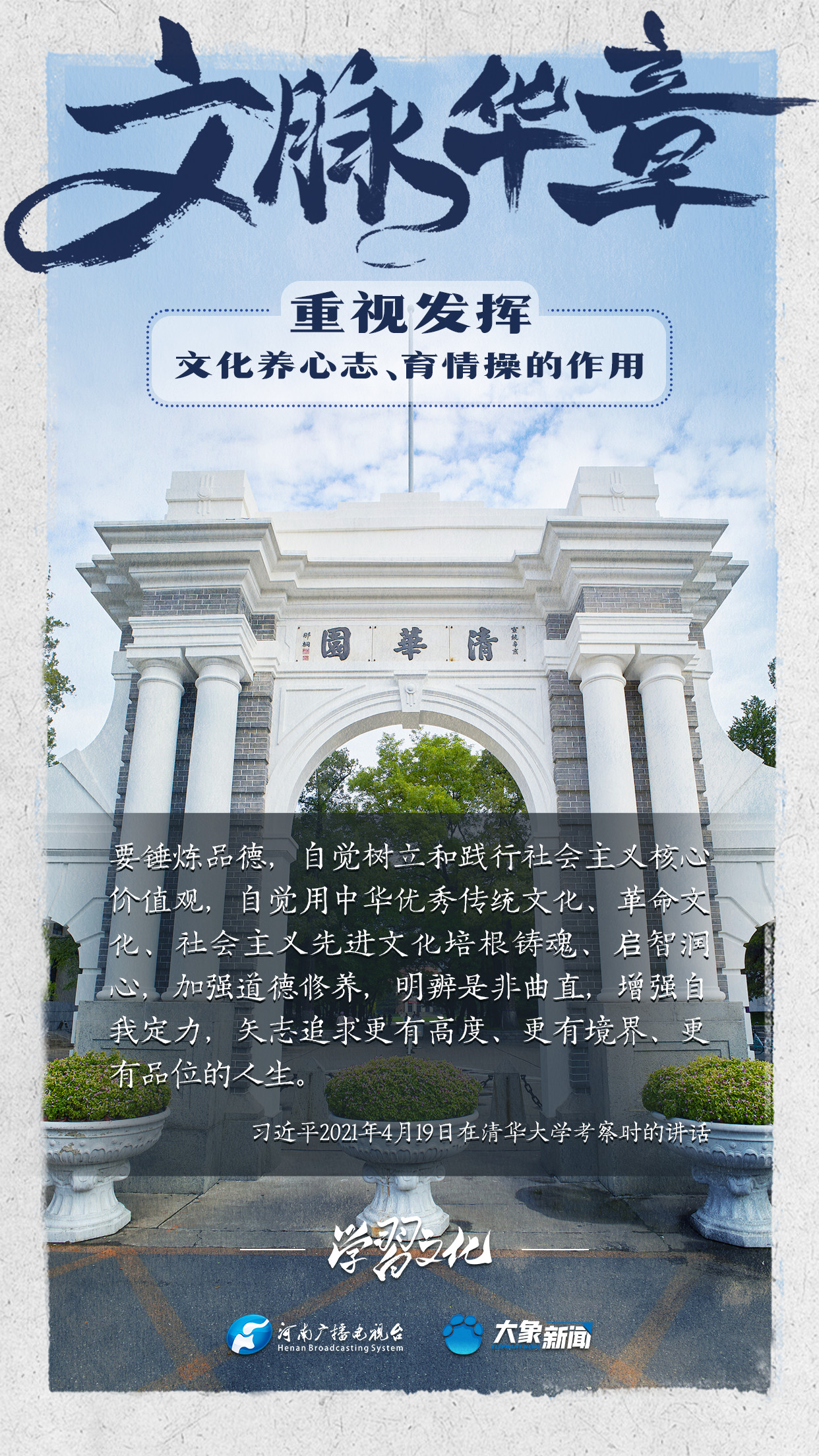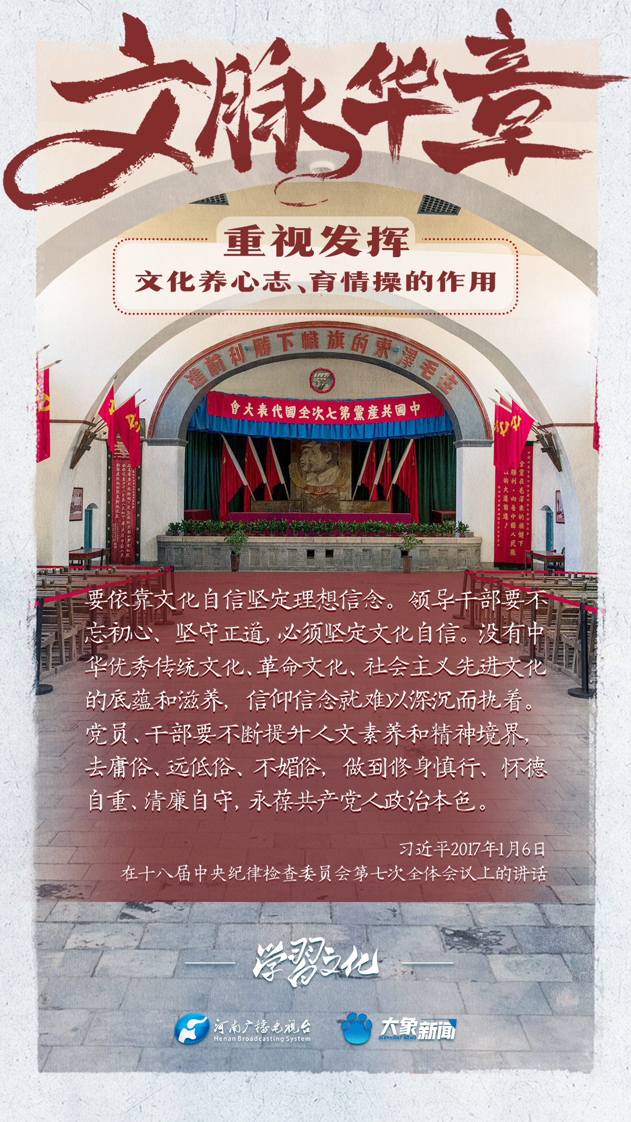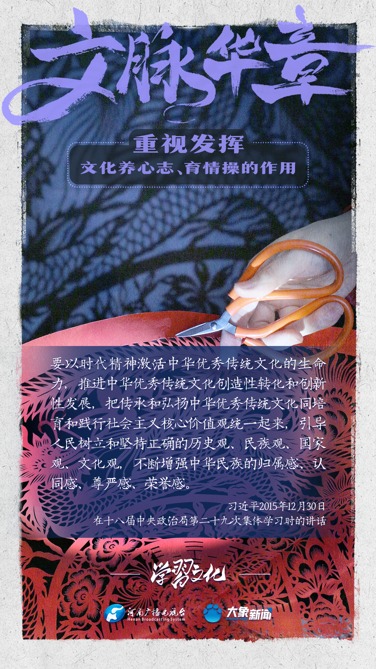 習(xí)近平總書記在主持中共中央政治局第十七次集體學(xué)習(xí)時強調(diào),重視發(fā)揮文化養(yǎng)心志、育情操的作用,涵養(yǎng)全民族昂揚奮發(fā)的精神氣質(zhì)??倳浉叨戎匾曃幕淖饔?,發(fā)表了一系列重要講話,倡導(dǎo)以文載道、以文傳聲、以文化人。我們一起學(xué)習(xí)。