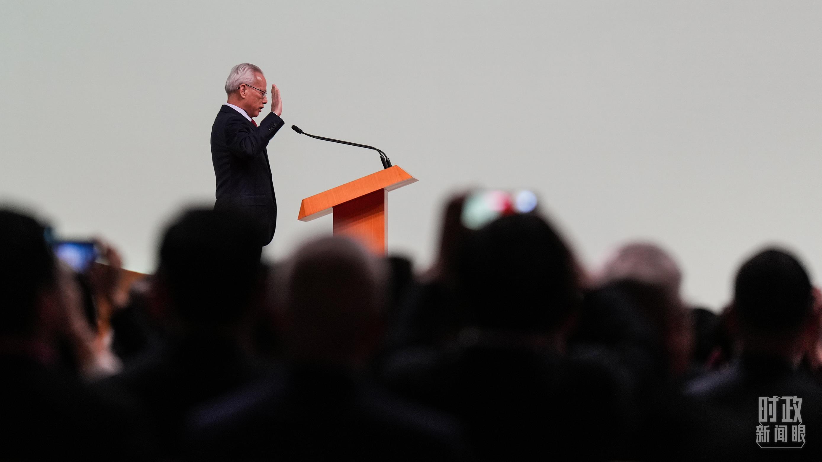 澳門特區(qū)第六任行政長(zhǎng)官岑浩輝莊嚴(yán)宣誓。(總臺(tái)記者李晉拍攝)
