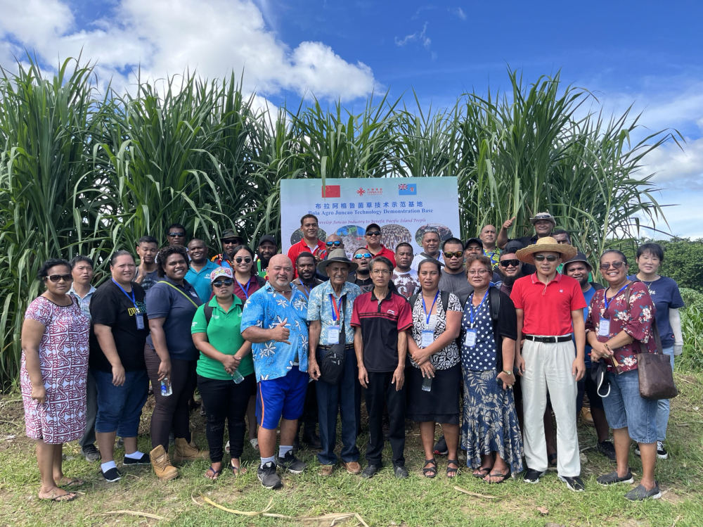 2024年2月28日,來自巴布亞新幾內(nèi)亞、湯加、庫克群島、薩摩亞、瑙魯?shù)葒业摹疤窖髰u國菌草技術(shù)培訓(xùn)班”學(xué)員在斐濟(jì)布拉阿格魯菌草技術(shù)示范基地合影。新華社發(fā)(中國援斐濟(jì)菌草技術(shù)示范中心供圖)