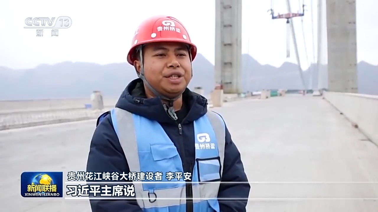 貴州花江峽谷大橋建設(shè)者 李平安:習(xí)近平主席說,新征程上,每一個人都是主角。我覺得非常自豪,心里也感到非常溫暖。我們正在建設(shè)的花江峽谷大橋春節(jié)前后即將合龍,將是世界第一高橋。我們一定會認真細致,高質(zhì)量地完成工程任務(wù),把中國式現(xiàn)代化的美好愿景,書寫在祖國的山川河流之間。