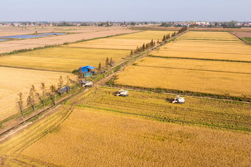 2024年11月1日,在湖南華容縣團洲垸,村民駕駛收割機收獲水稻(無人機照片)。新華社記者陳思汗 攝