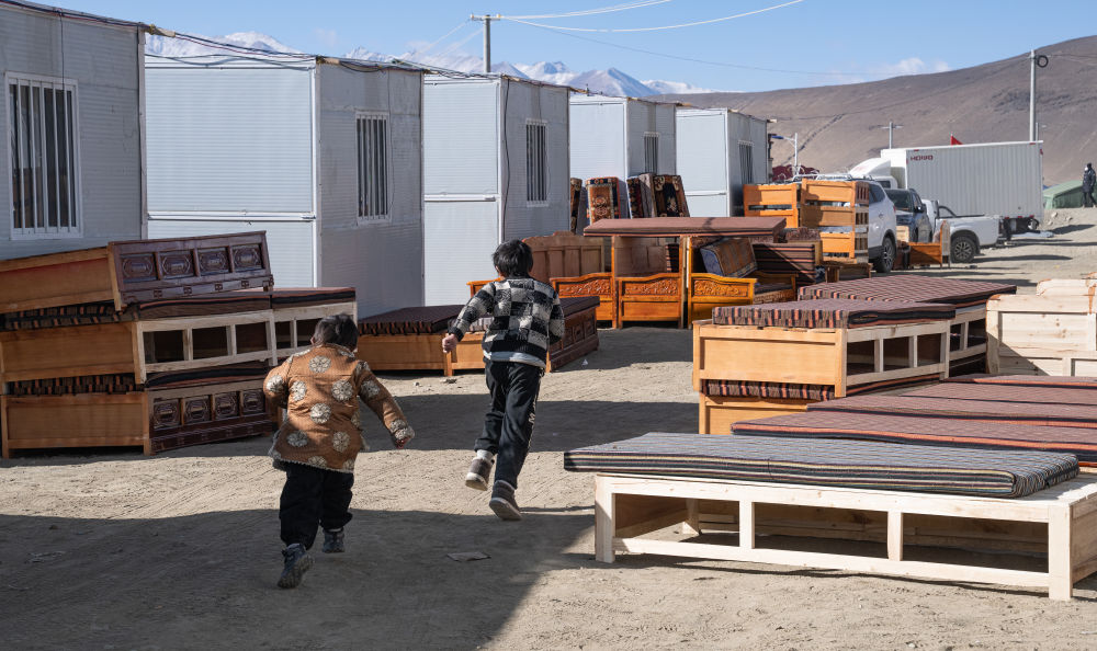2025年1月13日,在定日縣嘎旦村,兩個孩子在剛運來的兩排藏床間奔跑。新華社記者丁增尼達 攝