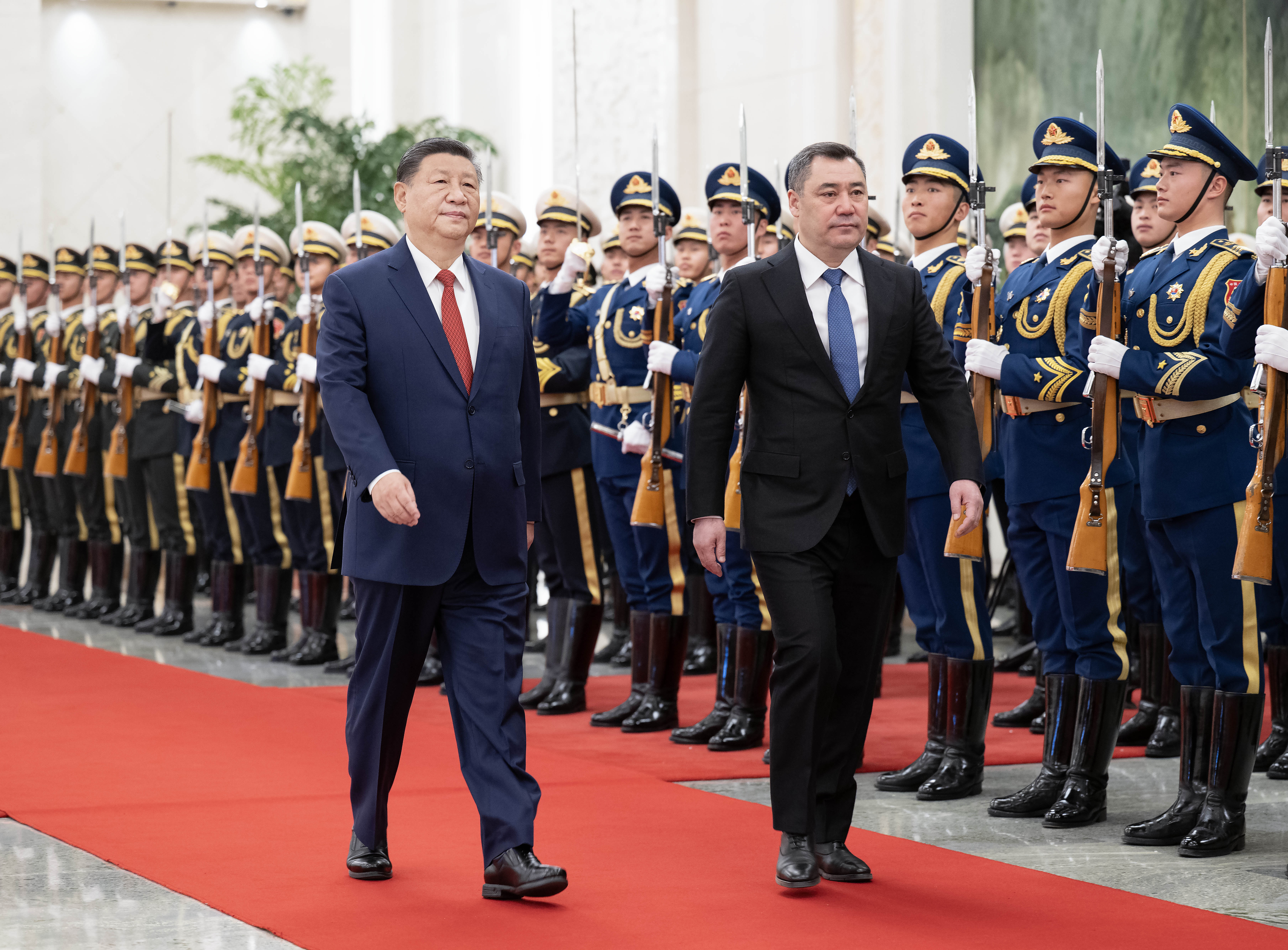 天安門(mén)廣場(chǎng)鳴放21響禮炮,禮兵列隊(duì)致敬。兩國(guó)元首登上檢閱臺(tái),軍樂(lè)團(tuán)奏中吉兩國(guó)國(guó)歌。扎帕羅夫在習(xí)近平陪同下檢閱中國(guó)人民解放軍儀仗隊(duì),并觀看分列式。
