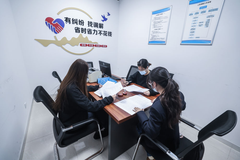 2025年2月25日,在浙江省嘉興市南湖區(qū)社會(huì)矛盾糾紛調(diào)處化解中心,調(diào)解員(右一)在調(diào)解金融借款合同糾紛。新華社記者 徐昱 攝