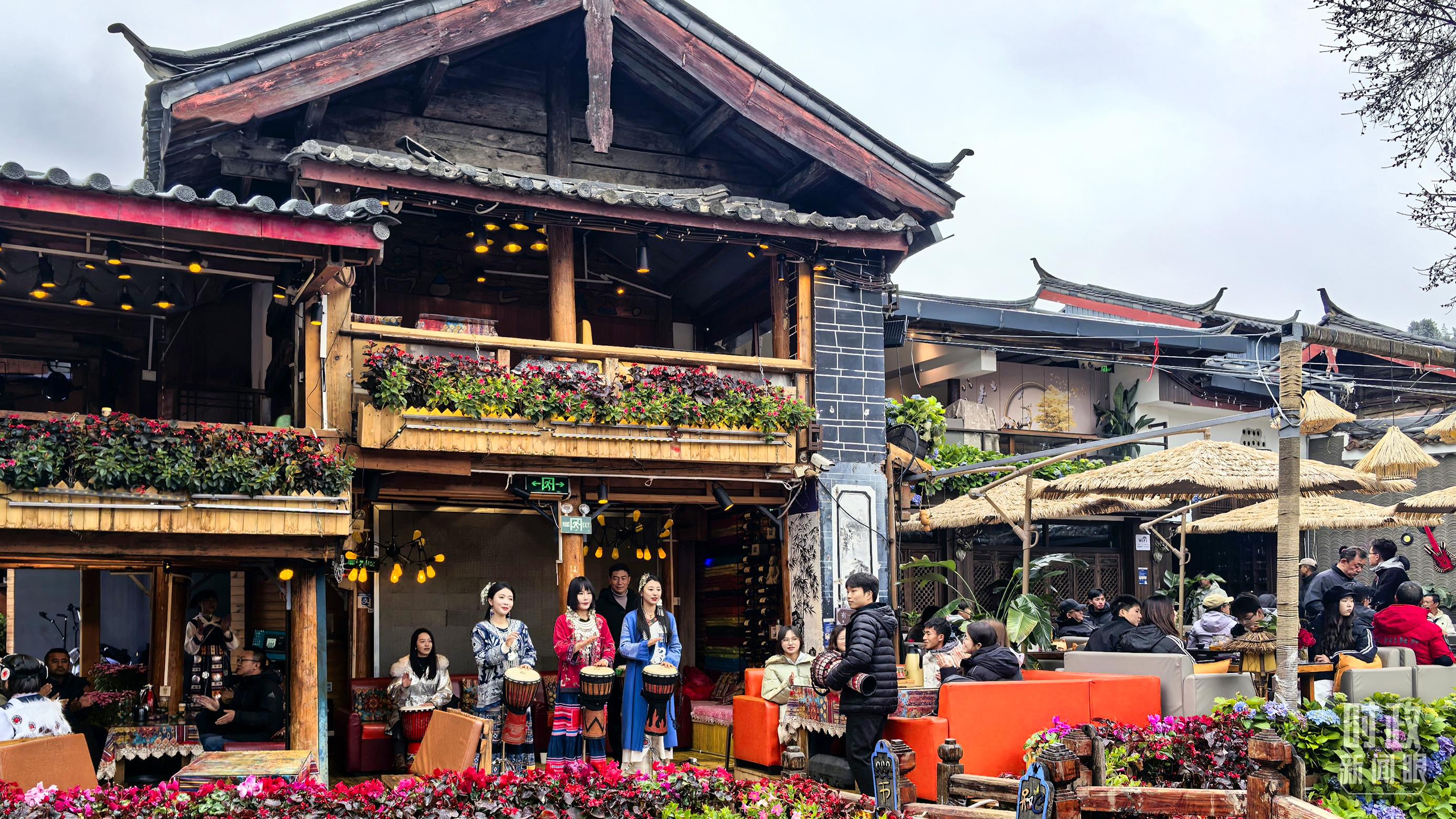 古城商鋪門口的手鼓演奏。(總臺央視記者鄂介甫拍攝)