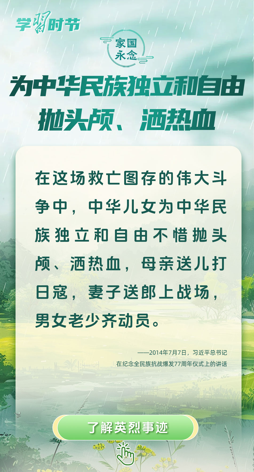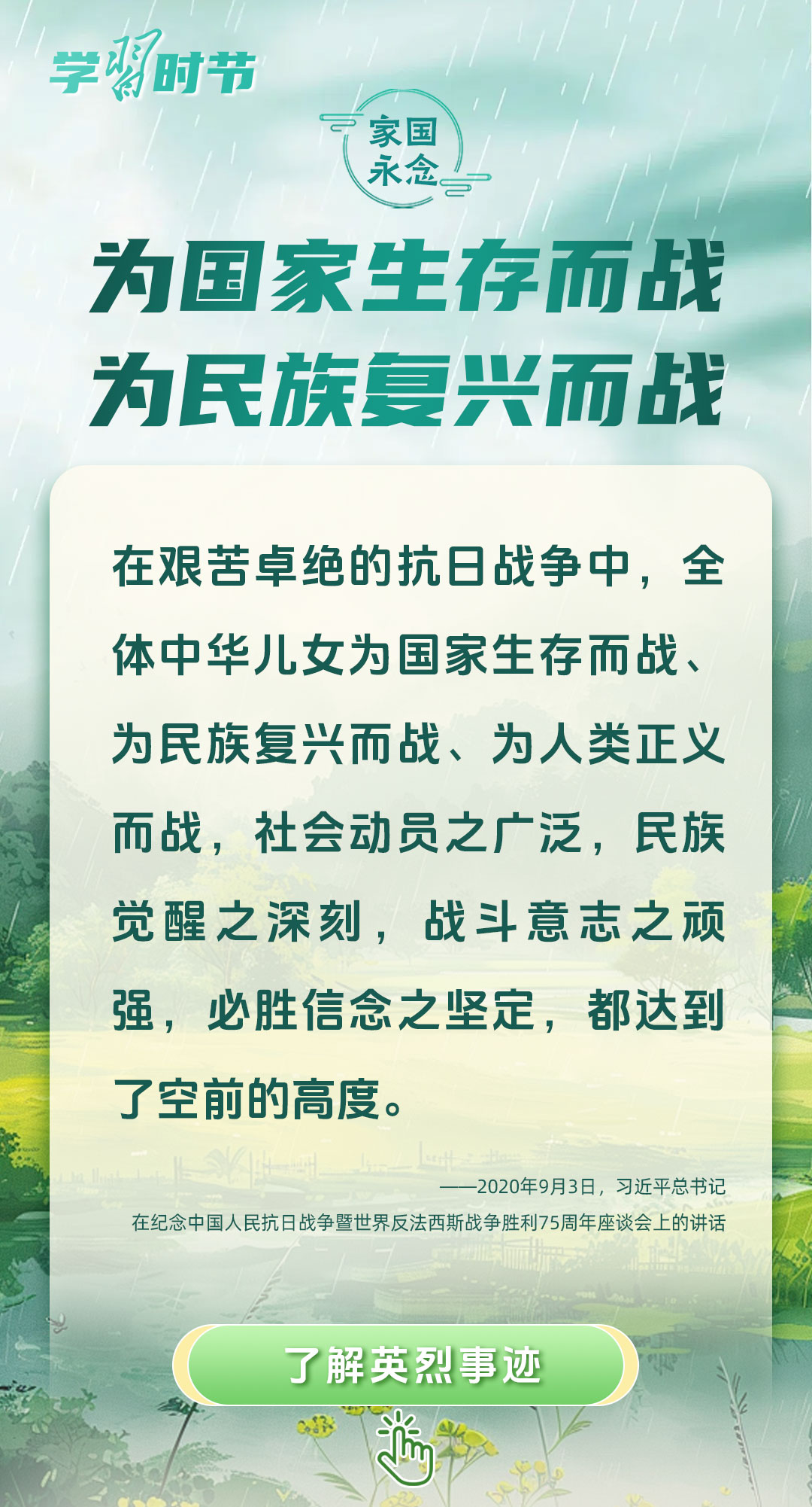 今年是中國人民抗日戰(zhàn)爭暨世界反法西斯戰(zhàn)爭勝利80周年、中國人民志愿軍抗美援朝出國作戰(zhàn)75周年。習近平總書記曾說:“對一切為國家、為民族、為和平付出寶貴生命的人們,不管時代怎樣變化,我們都要永遠銘記他們的犧牲和奉獻。”今天我們所擁有的一切,無不凝結著英雄、英烈們的奉獻付出乃至巨大犧牲。