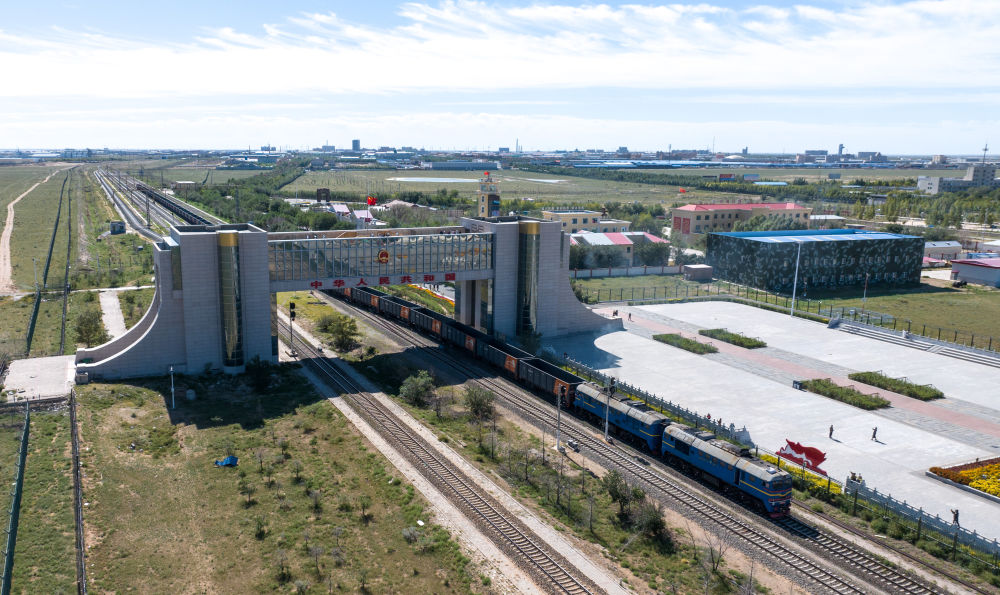 2024年8月20日,中歐班列在內(nèi)蒙古滿洲里口岸準(zhǔn)備出境(無(wú)人機(jī)照片)。滿洲里口岸位于中俄蒙三國(guó)交界處,是中國(guó)最大的陸路口岸,也是連接俄羅斯、蒙古國(guó)的重要樞紐。2024年,滿洲里口岸中歐班列通行量突破4000列,為推進(jìn)高質(zhì)量共建“一帶一路”注入新動(dòng)能。
