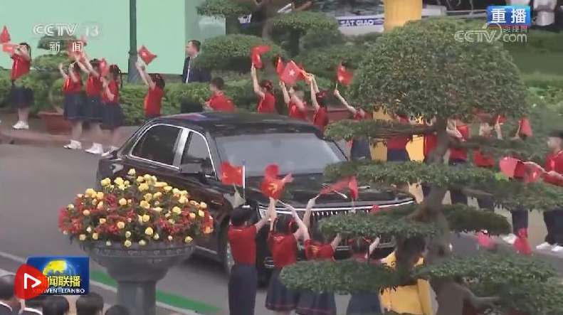 歡迎儀式后,習(xí)近平和蘇林一同步行前往越共中央駐地舉行會(huì)談。沿途數(shù)百名越南民眾揮舞兩黨兩國旗幟,對習(xí)近平表示最熱烈的歡迎。習(xí)近平向歡迎人群揮手致意。