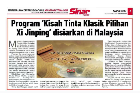 4月15日,馬來西亞中文、英文、馬來文主流媒體《星洲日?qǐng)?bào)》《星報(bào)》《陽光日?qǐng)?bào)》分別刊發(fā)節(jié)目在馬來西亞落播的消息。文章指出,《平“語”近人——習(xí)近平喜歡的典故》(馬來語版)特別選取了“萬物各得其和以生,各得其養(yǎng)以成”等典故,生動(dòng)闡釋中國(guó)堅(jiān)持不同文明之間平等交流、互學(xué)互鑒,愿意為人類破解時(shí)代難題、實(shí)現(xiàn)共同發(fā)展提供強(qiáng)大的精神指引,有助于馬來西亞民眾更好讀懂新時(shí)代中國(guó)之治的成功密碼,感知中國(guó)式現(xiàn)代化蓬勃發(fā)展的強(qiáng)勁脈動(dòng)。