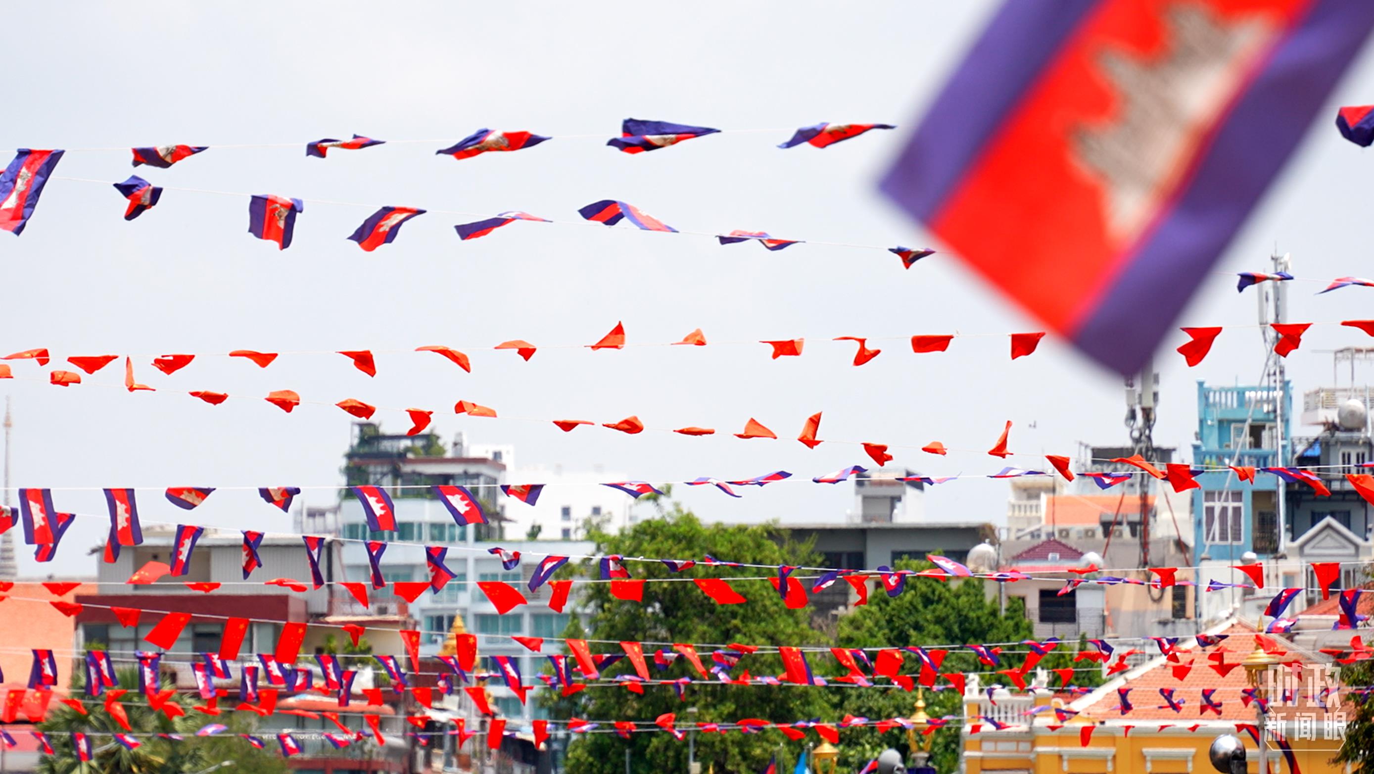 金邊街頭懸掛的中柬兩國國旗。(總臺央視記者盧心雨拍攝)