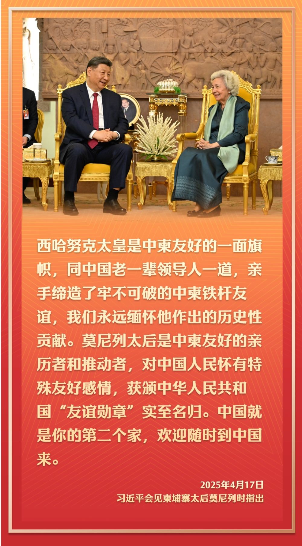 2016年10月13日,國家主席習近平在金邊看望柬埔寨太后莫尼列。莫尼列太后特意請習近平在西哈努克太皇生前常坐的椅子上就座。