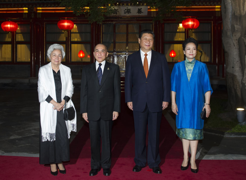 2014年9月25日晚,國家主席習近平在北京釣魚臺國賓館會見柬埔寨國王西哈莫尼和太后莫尼列。習近平主席夫人彭麗媛參加會見。
