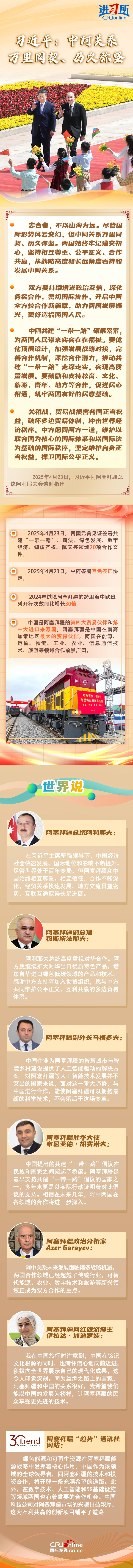 4月23日,中國國家主席習近平在北京同阿塞拜疆總統(tǒng)阿利耶夫舉行會談。兩國元首宣布,建立中阿全面戰(zhàn)略伙伴關(guān)系。習近平指出,盡管國際形勢風云變幻,但中阿關(guān)系萬里同契、歷久彌堅。雙方要持續(xù)增進政治互信,深化務(wù)實合作,密切國際協(xié)作,開啟中阿全方位合作新篇章,助力兩國發(fā)展振興,更好造福兩國人民。