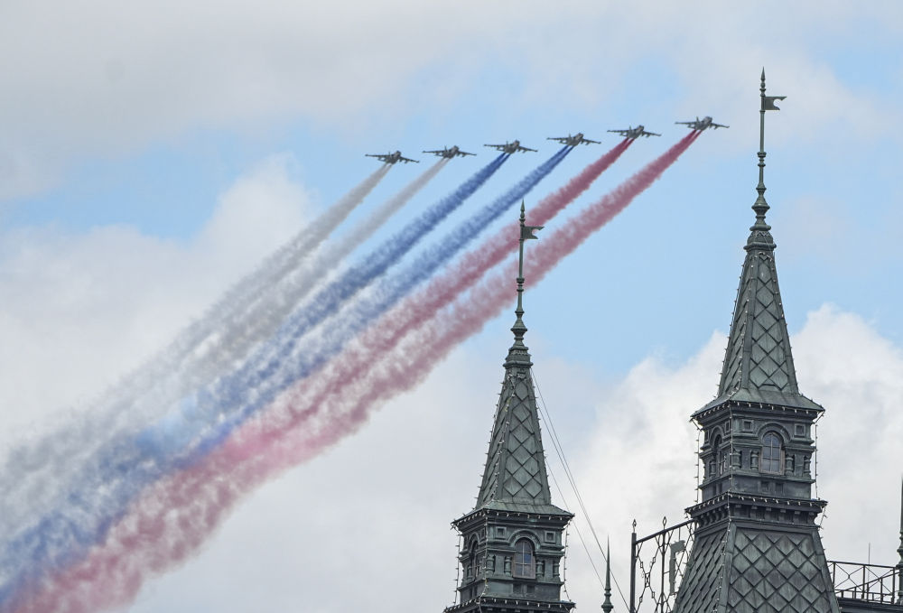 5月9日,在俄羅斯首都莫斯科,參加紀念蘇聯(lián)偉大衛(wèi)國戰(zhàn)爭勝利80周年閱兵式的戰(zhàn)機編隊拉煙飛行。新華社記者 賴向東 攝