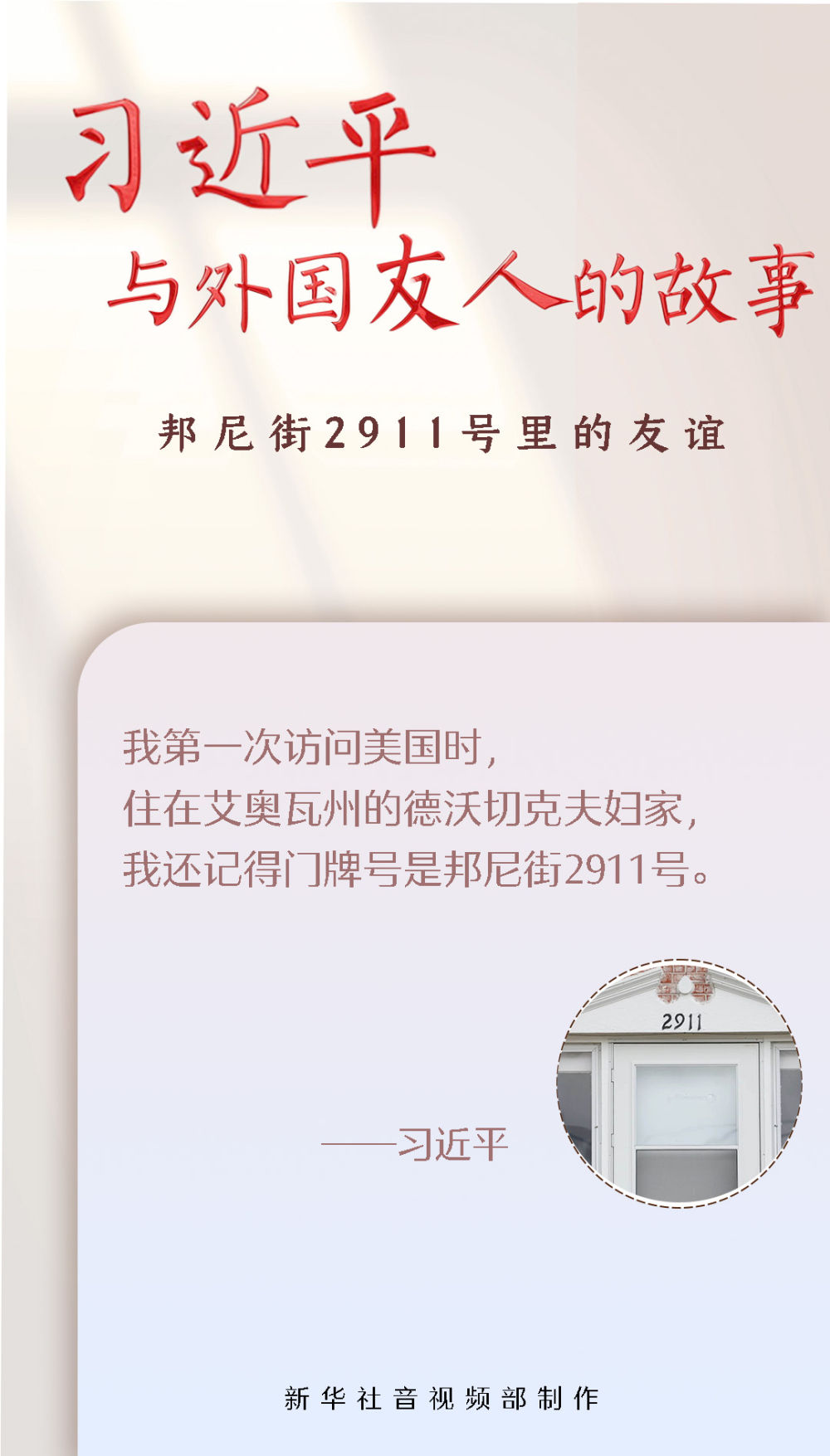 1985年,時任河北省正定縣委書記的習近平率團訪問艾奧瓦州,住在馬斯卡廷邦尼街2911號的德沃切克夫婦家中。那是習近平同美國民眾首次面對面接觸,訪問期間,他同當?shù)厝嗣窠Y下了深厚友誼。