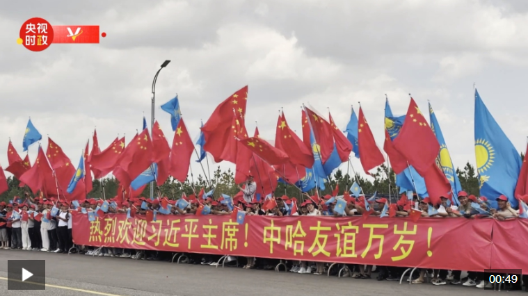 當(dāng)?shù)貢r(shí)間6月16日中午,習(xí)近平主席乘車(chē)從機(jī)場(chǎng)赴下榻飯店途中,中資企業(yè)和留學(xué)生代表聚集在道路兩旁,手持“熱烈歡迎習(xí)近平主席!”“中哈友誼萬(wàn)歲!”等紅色橫幅。哈方直升機(jī)沿途護(hù)衛(wèi),熱烈歡迎習(xí)近平主席到訪(fǎng)。