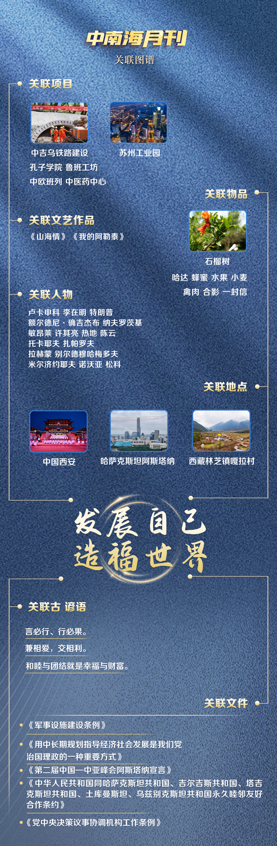關(guān)聯(lián)圖譜中西安、阿斯塔納兩個(gè)地點(diǎn),因中國(guó)與中亞五國(guó)的特殊情誼,有了別樣意義——兩年前,首屆中國(guó)—中亞峰會(huì)在古絲綢之路起點(diǎn)西安舉行。兩年后,第二屆中國(guó)—中亞峰會(huì)來(lái)到哈薩克斯坦首都阿斯塔納,這里正是共建“一帶一路”的首倡之地。