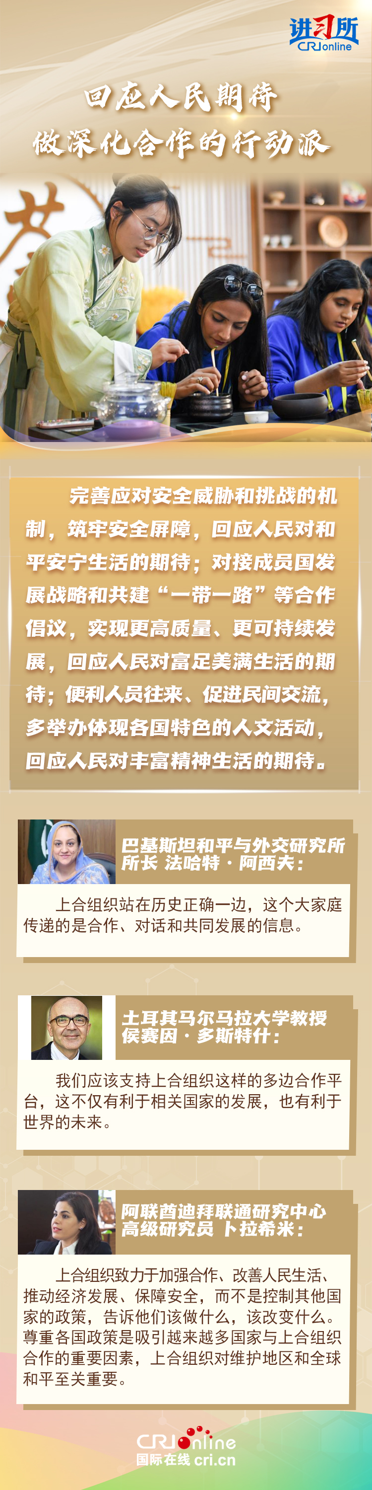 “讓‘上海精神’持續(xù)照亮構(gòu)建上海合作組織命運(yùn)共同體之路?!鄙虾:献鹘M織成立24年來,始終秉持“上海精神”,成功走出了一條順應(yīng)時(shí)代潮流、契合各方需求的區(qū)域合作道路,樹立起新型國(guó)際關(guān)系的典范。在國(guó)際人士眼中,上海合作組織站在歷史正確一邊,致力于建設(shè)一個(gè)更加平等,更加包容,更加公平公正的世界,對(duì)維護(hù)地區(qū)和全球和平至關(guān)重要。