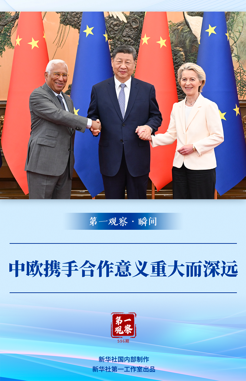 會見開始前的合影環(huán)節(jié),科斯塔主席、馮德萊恩主席主動向習近平主席伸出右手,三位領導人微笑著攜手面向記者合影留念。