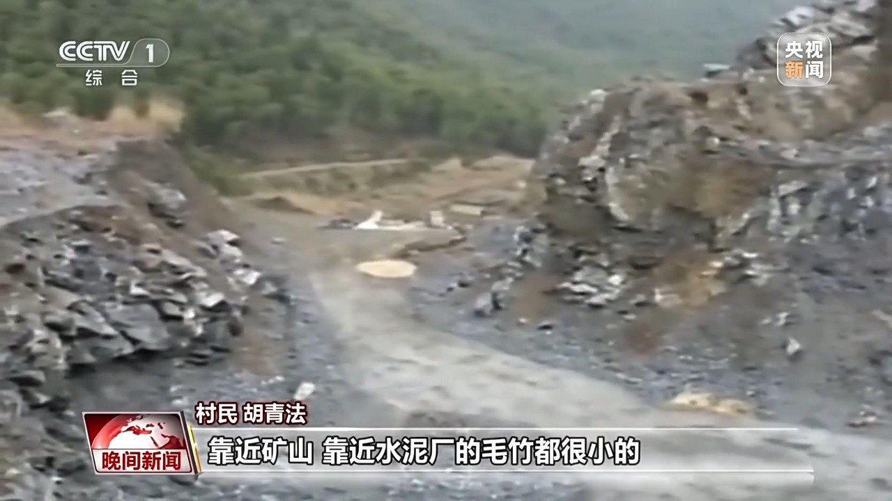村民 胡青法:那片山都是灰蒙蒙的。那時候很明顯,靠近礦山、靠近水泥廠的毛竹,都很小的。