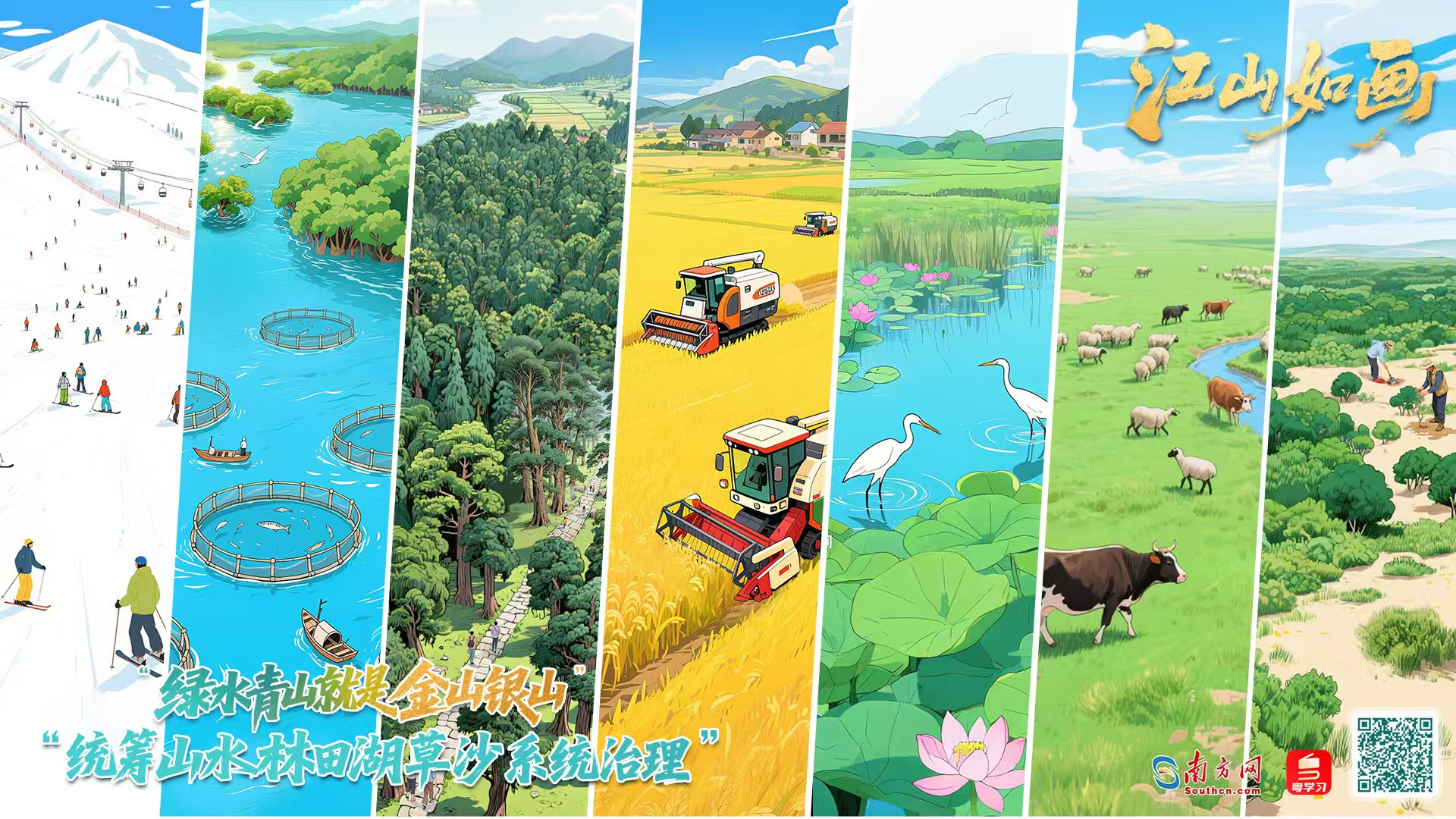 南方網(wǎng)、粵學(xué)習(xí)客戶端策劃制作“兩山”理念提出20周年紀(jì)念長(zhǎng)卷——《江山如畫(huà)》,選取習(xí)近平總書(shū)記曾實(shí)地考察過(guò)的湛江紅樹(shù)林、白洋淀、青藏高原等80余個(gè)地點(diǎn),沿海拔線一路攀升,描繪新時(shí)代“山水林田湖草沙一體化保護(hù)和系統(tǒng)治理”的生態(tài)文明建設(shè)新圖景。同步嵌入“習(xí)近平生態(tài)文明思想文庫(kù)”,立體呈現(xiàn)我國(guó)生態(tài)文明建設(shè)理論與實(shí)踐不斷深化、辯證統(tǒng)一的過(guò)程。