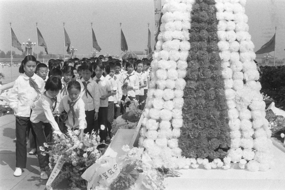 1985年,首都各界代表在天安門廣場人民英雄紀(jì)念碑前舉行獻花圈儀式,追念在抗日戰(zhàn)爭中犧牲的將士和死難同胞。這是海淀區(qū)少先隊員在敬獻花圈。