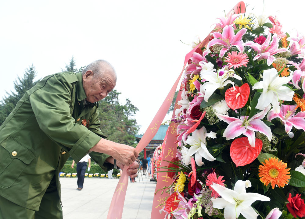 2015年8月15日,吉林省紀(jì)念東北抗聯(lián)精神大會在吉林通化舉行,各界群眾來到通化市楊靖宇烈士陵園,緬懷犧牲的東北抗聯(lián)將士。這是一位東北抗聯(lián)老戰(zhàn)士為烈士敬獻花圈。