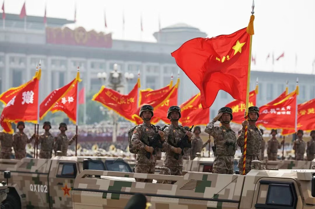 80面抗戰(zhàn)英模部隊榮譽旗幟組成戰(zhàn)旗方隊