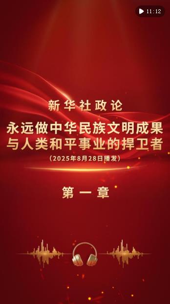 新華社8月28日播發(fā)《新華社政論|永遠(yuǎn)做中華民族文明成果與人類和平事業(yè)的捍衛(wèi)者——寫在中國(guó)人民抗日戰(zhàn)爭(zhēng)暨世界反法西斯戰(zhàn)爭(zhēng)勝利80周年之際》。我們邀請(qǐng)誦讀嘉賓任志宏演播“第一章”。