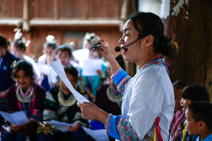 2025年9月26日,內(nèi)蒙古興安盟科右中旗巴彥呼舒第六中學(xué)美術(shù)教師、非遺代表性傳承人吳斯琴(左四)指導(dǎo)學(xué)生刺繡。近年來,內(nèi)蒙古興安盟科爾沁右翼中旗巴彥呼舒第六中學(xué)將當(dāng)?shù)貒壹壏沁z圖什業(yè)圖刺繡引入校園,開設(shè)校本課程,并成立興趣社團(tuán),在豐富校園文化生活的同時,讓學(xué)生們近距離感受非遺的魅力,弘揚(yáng)和傳承中華優(yōu)秀傳統(tǒng)文化。隨著國產(chǎn)動畫電影《哪吒之魔童鬧?!凡粩嗨⑿轮袊笆菲狈考o(jì)錄,參與電影配樂的貴州省榕江縣三寶侗寨的楊想妮和“舞樂蟬歌”團(tuán)隊為更多人所熟知。樂團(tuán)成員懷揣“用音樂傳遞侗族文化,讓世界聽見侗族大歌”的共同夢想,將侗族大歌推向更廣闊的舞臺。這是2025年4月22日,楊想妮在貴州省黎平縣肇興鎮(zhèn)廈格侗寨教前來研學(xué)的孩子們唱侗歌。