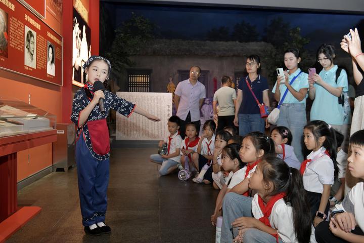 2025年8月7日,在山東省臨沂市沂蒙革命紀(jì)念館,沂蒙紅孩子文藝先鋒隊的房沫昕在講述紅色故事《沂蒙紅嫂祖秀蓮》。2024年9月,位于沂蒙革命老區(qū)的山東省臨沂市以“傳承沂蒙精神”為宗旨組建沂蒙紅孩子文藝先鋒隊,通過歌舞、朗誦、故事講述、舞臺劇等紅色主題文藝節(jié)目,增強(qiáng)紅色文化感染力,不斷為紅色基因代代相傳注入新生力量。2025年5月12日,云南省昭通市威信縣第一中學(xué)學(xué)生在大屏上紅色研學(xué)實踐基地體驗編織草鞋。200余名學(xué)生在紅色研學(xué)實踐基地親手編織草鞋、制作蠟染,并參觀了扎西會議舊址、紅軍長征過云南情景體驗館,在實踐互動中重溫紅色革命歷史。威信縣立足紅色文化資源優(yōu)勢,先后建成扎西會議紀(jì)念館、紅軍長征標(biāo)語館等紅色文化展館,以舊址遺跡為“教室”,以文物史料為“教材”,設(shè)計開發(fā)多門精品研學(xué)課程和線路,在深入開展紅色研學(xué)系列活動中傳承紅色基因。