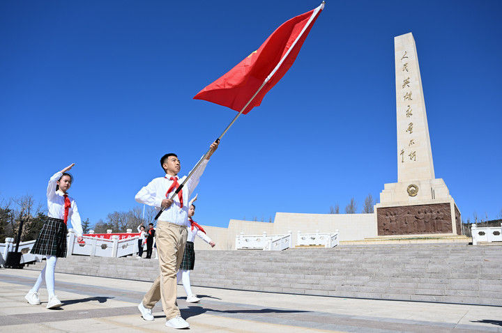 這是2025年4月2日在內(nèi)蒙古呼和浩特市大青山紅色文化公園拍攝的中國少年先鋒隊出旗儀式。