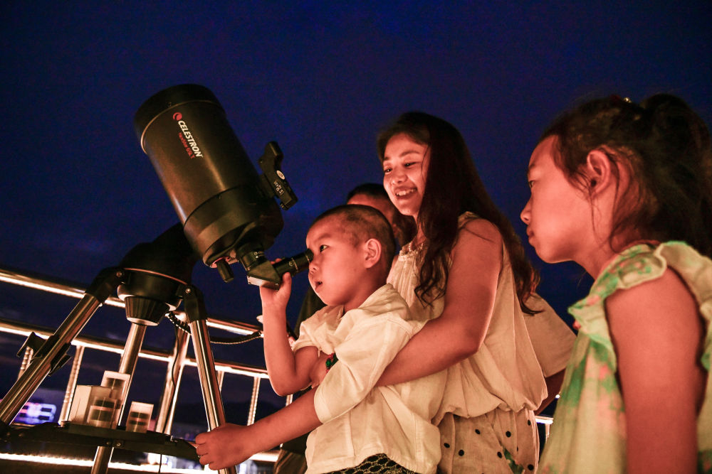 2025年7月9日,游客在貴州省平塘縣克度“天文小鎮(zhèn)”通過望遠鏡觀測星空。近年來,隨著旅游設施逐漸完善,距離“中國天眼”僅8公里的克度“天文小鎮(zhèn)”通過“科普+文旅”發(fā)展模式,帶動村民就業(yè)創(chuàng)業(yè)、增收致富。2025年1月至6月,“中國天眼”景區(qū)共接待游客約38萬人次,總收入2496萬余元。