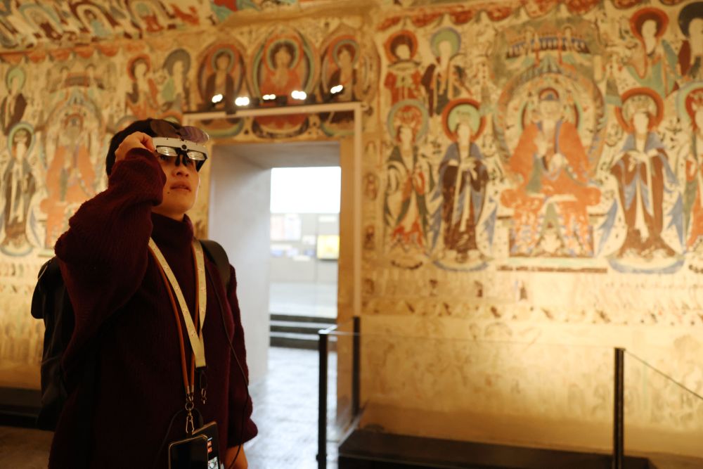 2024年7月22日,一名游客在敦煌莫高窟“尋境敦煌——數(shù)字敦煌沉浸展”上借助VR設備沉浸式游覽莫高窟第285窟虛擬場景?!皩ぞ扯鼗汀本C合運用了VR虛擬現(xiàn)實、三維建模、游戲引擎的物理渲染和全局動態(tài)光照等新技術,高精度立體還原了莫高窟第285窟。游客戴上VR眼鏡,不僅可以零距離觀賞壁畫、360度自由探索洞窟細節(jié),還能“飛升”到窟頂,身臨其境參與壁畫故事情節(jié),沉浸式感受敦煌文化的魅力。
