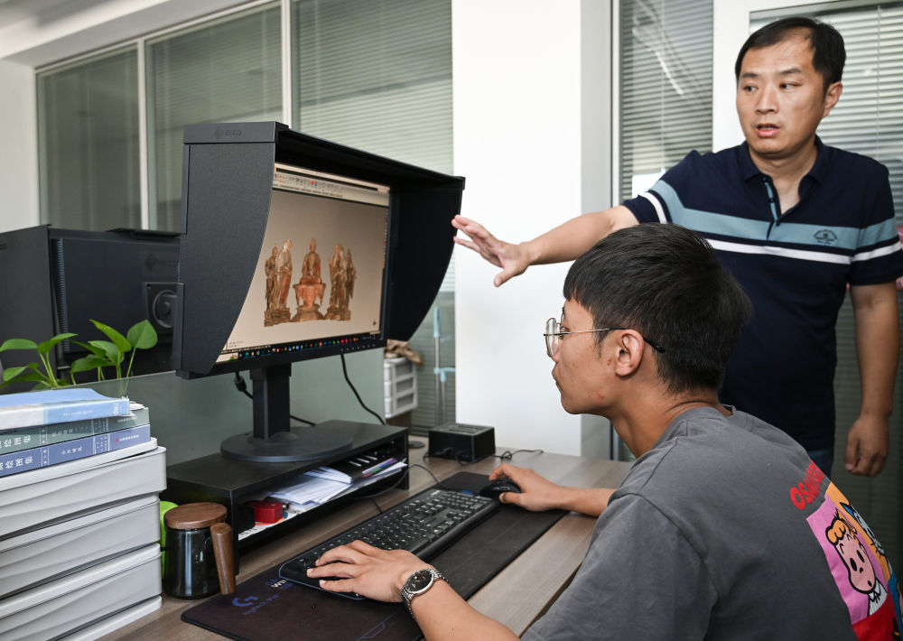 2023年8月3日,敦煌研究院文物數(shù)字化研究所的工作人員在展示莫高窟彩塑三維重建的成果。近年來,敦煌研究院持續(xù)加大文物保護基礎研究和應用研究,不斷加強文物科技保護力度,提升科研平臺建設,為文物保護和文化遺產事業(yè)發(fā)展奠定良好基礎。