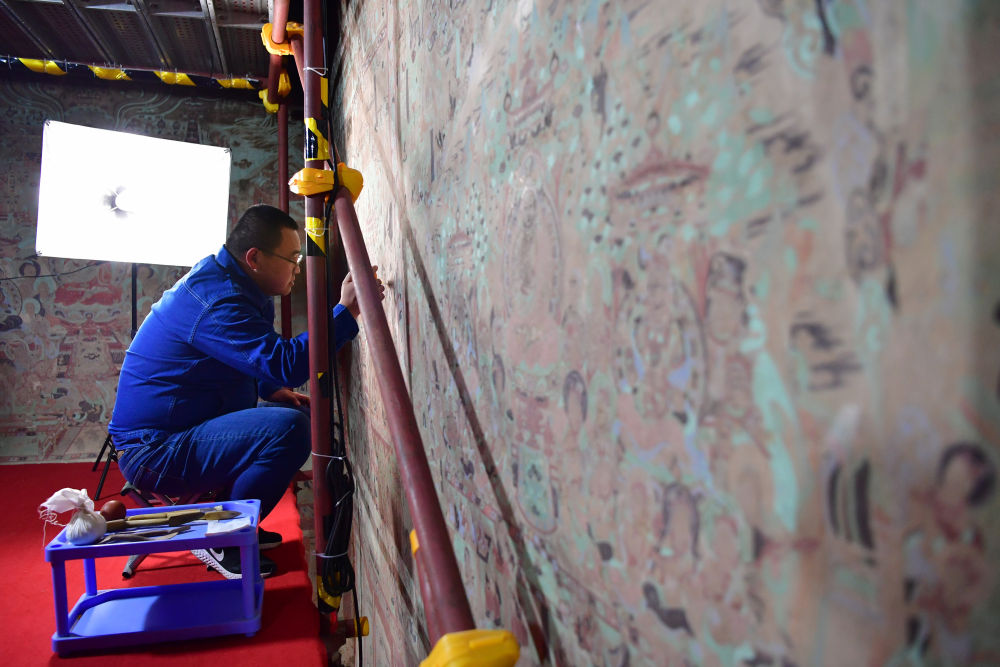 2022年4月19日,敦煌研究院文物保護技術服務中心的壁畫修復師楊金禮在莫高窟第231窟內修復壁畫。