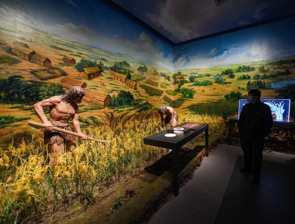2022年1月21日,觀眾在成都市寶墩遺址展館參觀“寶墩遺址與寶墩文化展”。該展覽講述了寶墩文化時(shí)期,古蜀先民深入成都平原扎根繁衍、筑城而居、種植稻米等歷史。