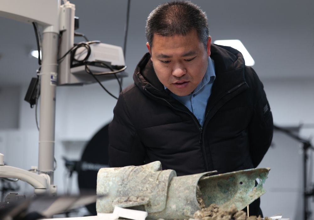 2024年12月16日,考古專家在三星堆研究院仔細(xì)查看一件青銅面具。當(dāng)日,古蜀文明保護(hù)傳承二期工程在三星堆研究院啟動。