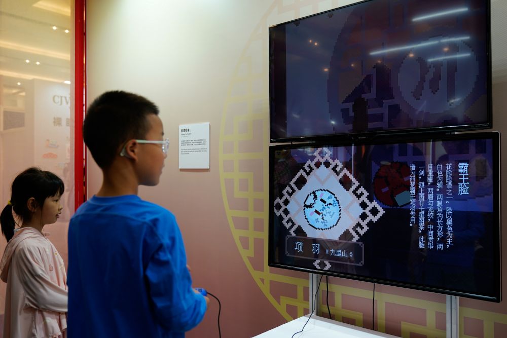 2025年5月31日,在第九屆中國成都國際非物質(zhì)文化遺產(chǎn)節(jié)上,小朋友通過互動游戲了解川劇臉譜。