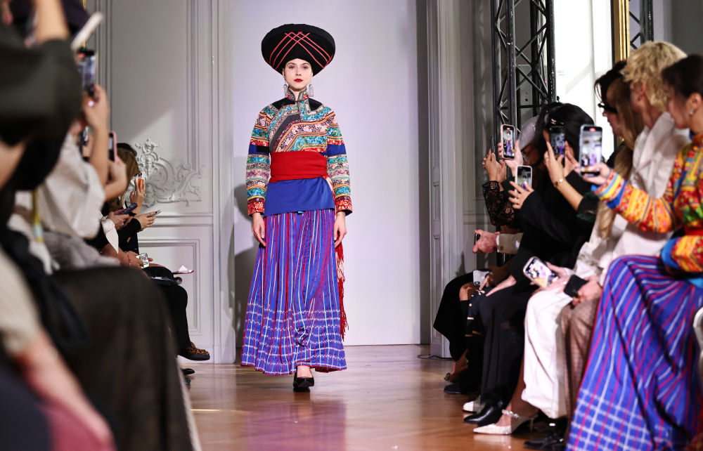 2025年10月1日,在法國巴黎中國文化中心舉行的第三屆中法時(shí)裝周上,模特在“非遺四川·百城百藝”鹽邊·傈僳族服飾時(shí)尚秀上展示服裝。