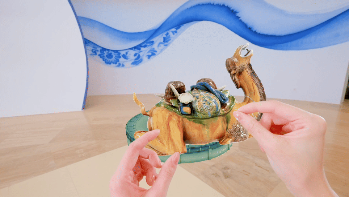 “這款MR眼鏡使用的就是3D技術(shù),該技術(shù)能夠清晰地將文物的紋飾紋樣、顏色、形制等信息采集下來(lái)。戴上MR眼鏡后,觀眾能夠放大縮小、旋轉(zhuǎn)文物,增強(qiáng)了觀看體驗(yàn)?!崩钤凑f(shuō)。