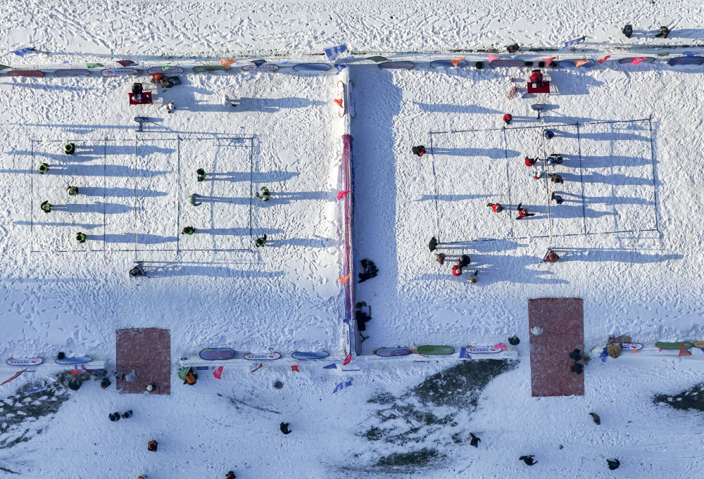 2025年12月25日,人們在第八屆哈爾濱松花江冰雪嘉年華園區(qū)內(nèi)體驗冰上排球(無人機照片)。本屆冰雪嘉年華推出近60項特色項目,為市民與游客打造多樣化的冰雪體驗。