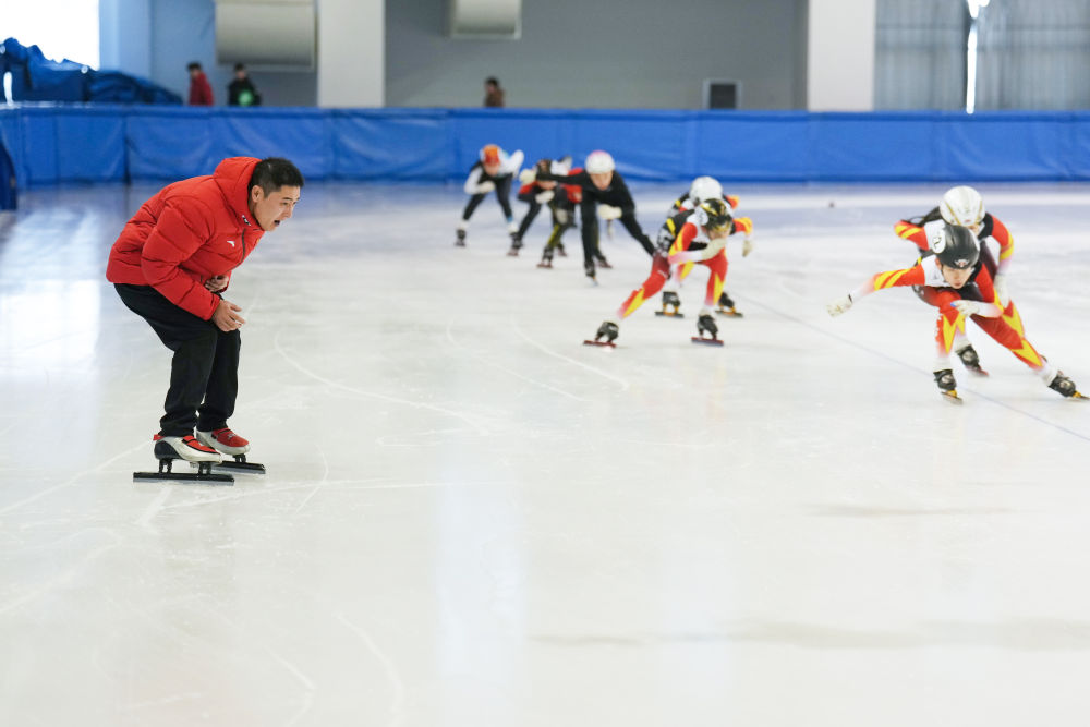 2025年1月24日,短道速滑教練姚忠華(左)在黑龍江省七臺河市短道速滑館指導(dǎo)運動員進行冰上訓(xùn)練。十余年來,姚忠華累計執(zhí)教培養(yǎng)過200余名運動員。七臺河市擁有“奧運冠軍之城”的城市名片,在這里,教練員們一起筑夢冰場,為我國冰雪人才的儲備奉獻自己的力量。