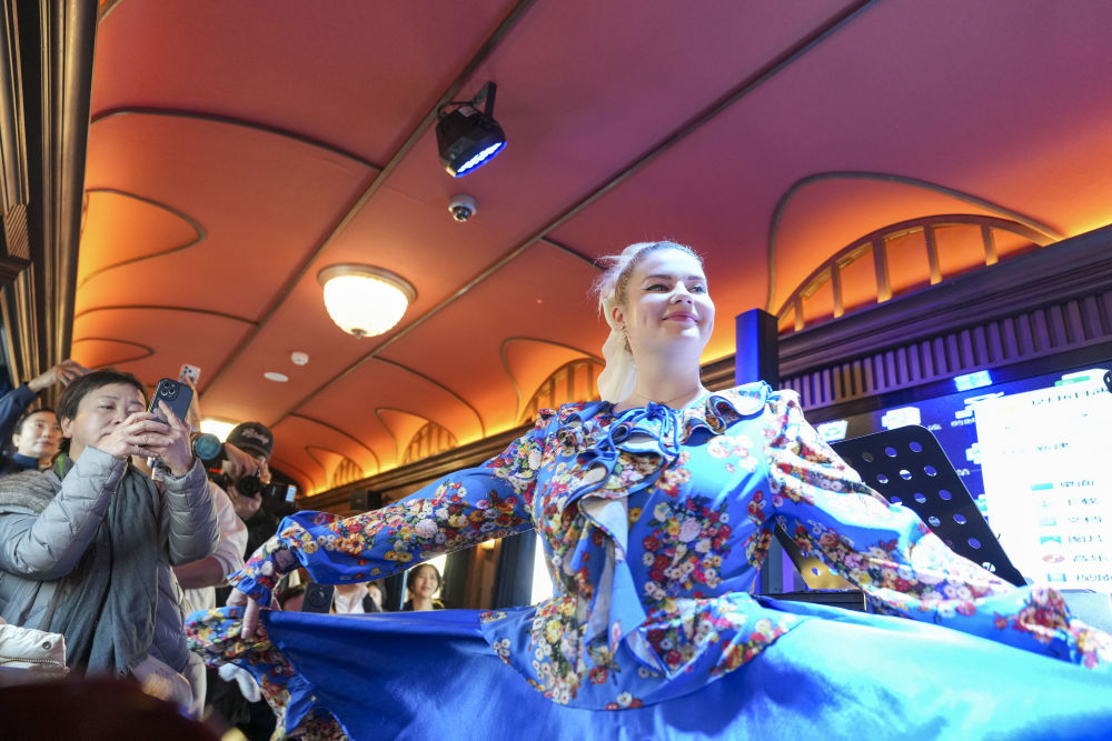 2025年12月6日,演員在黑龍江省“伊春號”旅游專列車廂中表演。當(dāng)日,“伊春號”旅游專列投入試運行,40余名受邀體驗的游客乘專列由哈爾濱站出發(fā),去往亞布力滑雪旅游度假區(qū)。2025年以來,中國鐵路哈爾濱局集團有限公司陸續(xù)開行了多趟旅游列車,將特色體驗、民俗展示、定制化服務(wù)等進行融合,滿足游客需求,服務(wù)旅客出行。