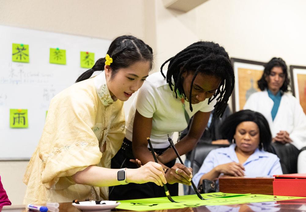 2025年4月17日,在南非約翰內(nèi)斯堡,學生與孔子學院志愿者在“國際中文日”活動上寫毛筆字。