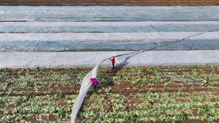 2025年12月11日,山東東營廣饒縣,農(nóng)民為作物覆蓋防寒無紡布。